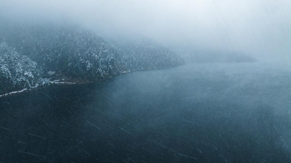 風雪中的措木及日景區(qū)(無人機照片,10月20日攝)。措木及日位于西藏林芝市八一鎮(zhèn)市郊,是一座古冰磧湖。新華社記者 丁增尼達 攝