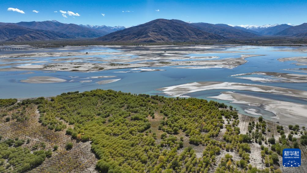 這是雅魯藏布江寬闊的河床和岸邊種植的樹(shù)木(2024年10月24日攝,無(wú)人機(jī)照片)。新華社記者 晉美多吉 攝