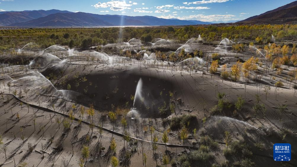 在雅魯藏布江畔,自動(dòng)灌溉設(shè)備給樹(shù)木澆水(2024年10月24日攝,無(wú)人機(jī)照片)。新華社記者 晉美多吉 攝