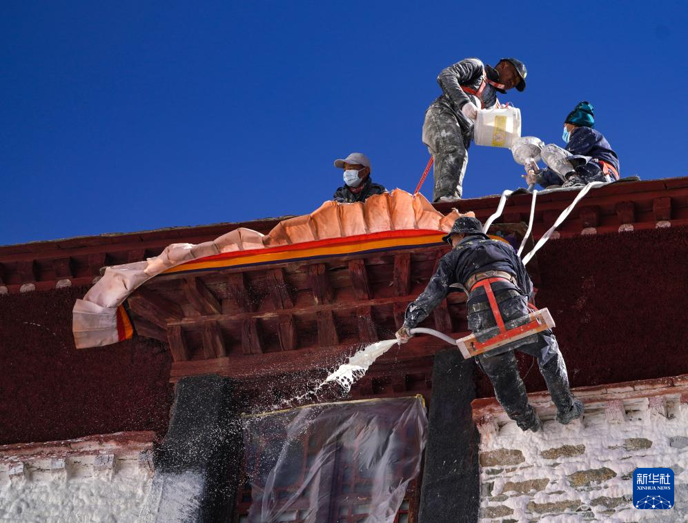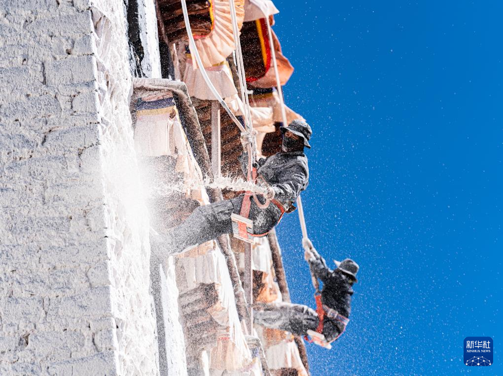 10月28日,布達(dá)拉宮管理處的工作人員在噴灑涂料。新華社記者 旦增尼瑪曲珠 攝