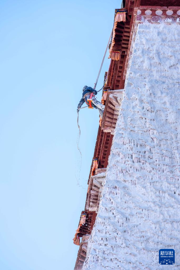 10月30日,布達(dá)拉宮管理處的工作人員在噴灑涂料。新華社記者 丁增尼達(dá) 攝