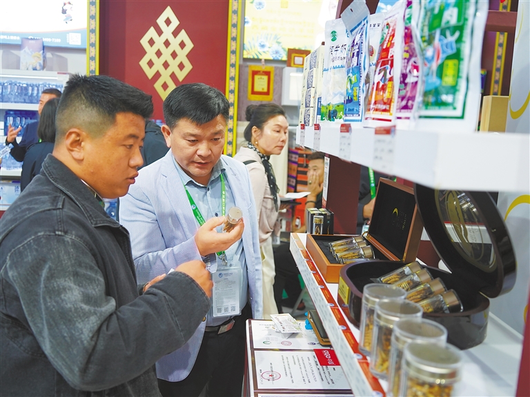 圖為西藏展館內(nèi),西藏參展企業(yè)代表向顧客介紹展品。記者 張宇 攝
