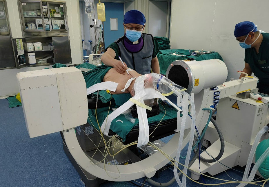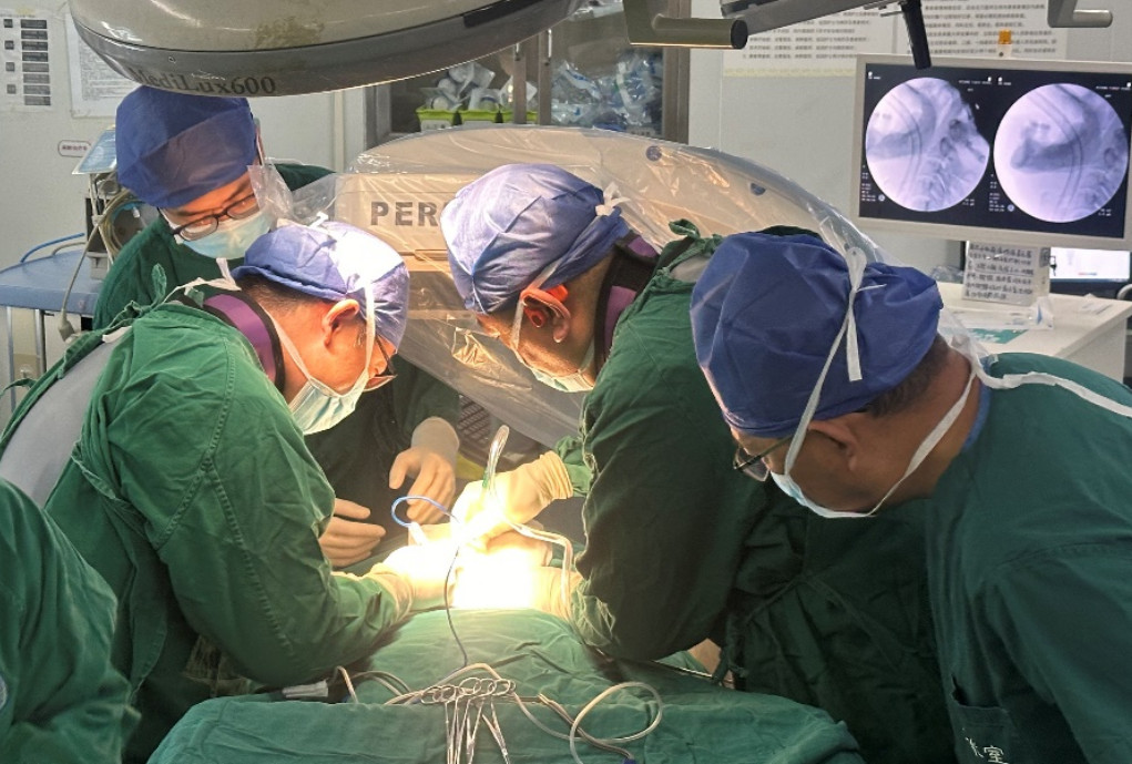 術(shù)中情況。左下為蔡思逸主任,右下為彭超主任醫(yī)師,右二為洛絨赤乃副主任醫(yī)師。