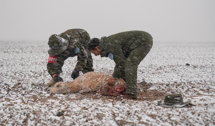 由于母羊倒下的位置距離營(yíng)地太近,野狼不敢上前享用自己的獵物,只能悻悻而去。野管隊(duì)員們看到風(fēng)雪中掙扎的母羊,心中不忍,將母羊抬到帳篷中進(jìn)行救助。但由于傷勢(shì)太重,母羊肚皮被咬開(kāi)且內(nèi)臟嚴(yán)重受損,野保隊(duì)員只能將它的肚皮縫上之后,按照慣例放歸到羌塘大草原。