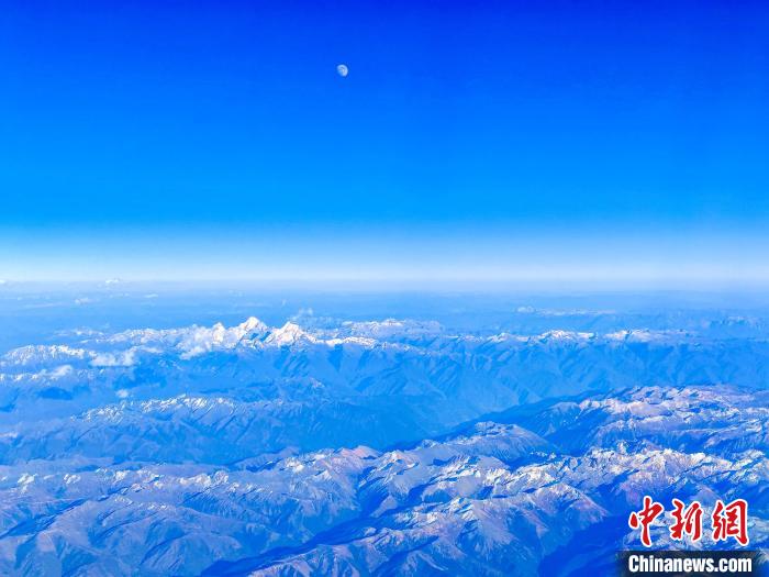 近日,中新網(wǎng)記者從云南昆明長水國際機場乘機前往西藏自治區(qū)拉薩市,飛機穿過橫斷山脈,抵達(dá)雪域高原。望向窗外,沿途依次看到了玉龍雪山、南迦巴瓦雪山以及遠(yuǎn)遠(yuǎn)的念青唐古拉雪山等,還有很多小新也不知道名字的雪山,可謂實現(xiàn)了“雪山自由”。圖為11月13日,從飛機上拍到的月亮與玉龍雪山(右下方)。記者 江飛波 攝