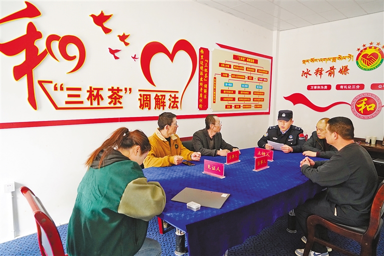 圖為帕里邊境派出所民警在“三杯茶”調(diào)解室調(diào)處矛盾糾紛。記者 張宇 通訊員 白瑪倉(cāng)覺(jué) 攝
