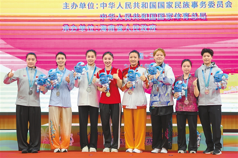 獲獎(jiǎng)選手在頒獎(jiǎng)儀式上合影,其中西藏代表團(tuán)選手趙爽(左四)獲得女子傳統(tǒng)雙器械一等獎(jiǎng)。新華社記者 張麗蕓 攝