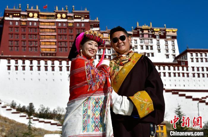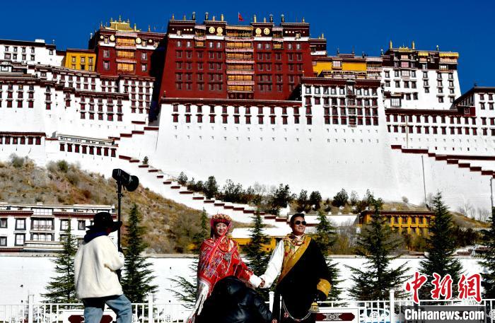 圖為12月3日,來(lái)自四川的勇忠阿旦(右一)和澤仁夏姆在布達(dá)拉宮廣場(chǎng)拍照留念。中新社記者 李林 攝
