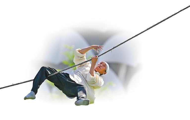 第十二屆全國少數(shù)民族傳統(tǒng)體育運(yùn)動(dòng)會(huì),西藏隊(duì)選手表演《強(qiáng)桿踏許》。