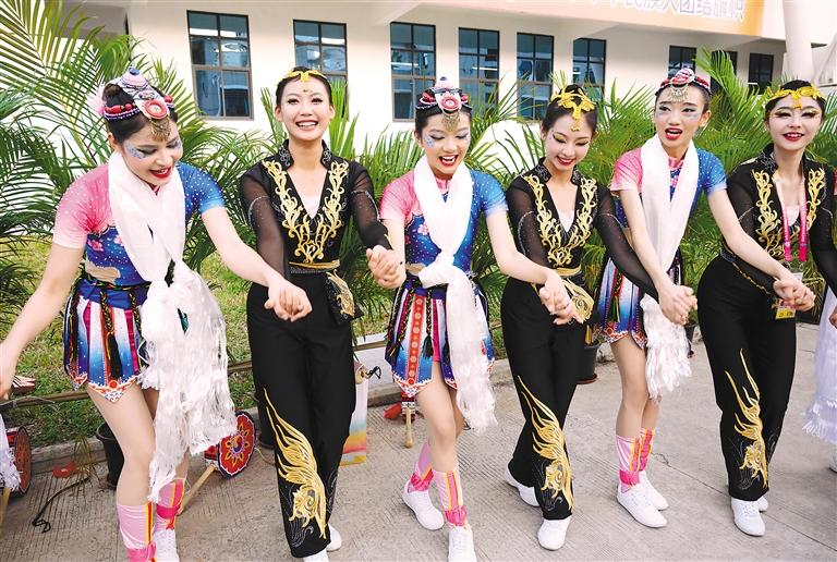 第十二屆全國少數(shù)民族傳統(tǒng)體育運(yùn)動(dòng)會(huì)西藏代表團(tuán)民族健身操運(yùn)動(dòng)員賽后與福建代表團(tuán)運(yùn)動(dòng)員一起跳鍋莊。
