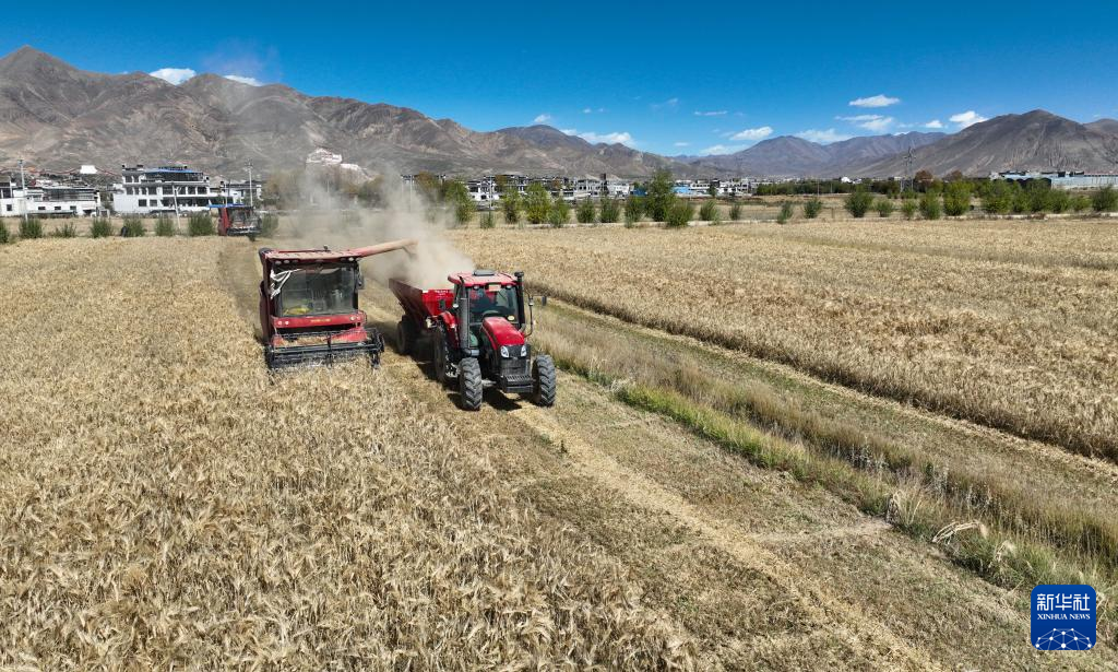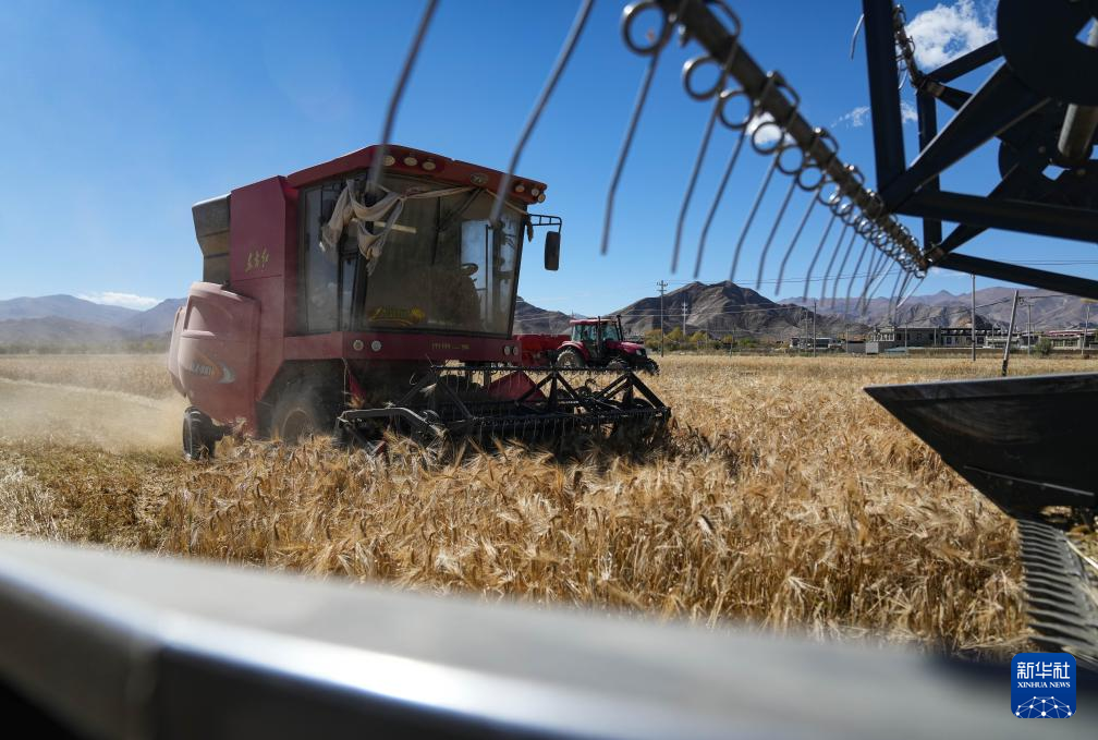 西藏日喀則市江孜縣江熱鄉(xiāng)班覺(jué)倫布村農(nóng)機(jī)服務(wù)農(nóng)民專(zhuān)業(yè)合作社的社員使用農(nóng)機(jī)收獲青稞(10月16日攝)。新華社記者 晉美多吉 攝