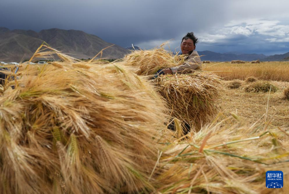 農(nóng)民在西藏日喀則市年楚河流域的田里收獲成熟的青稞(9月10日攝)。新華社記者 晉美多吉 攝