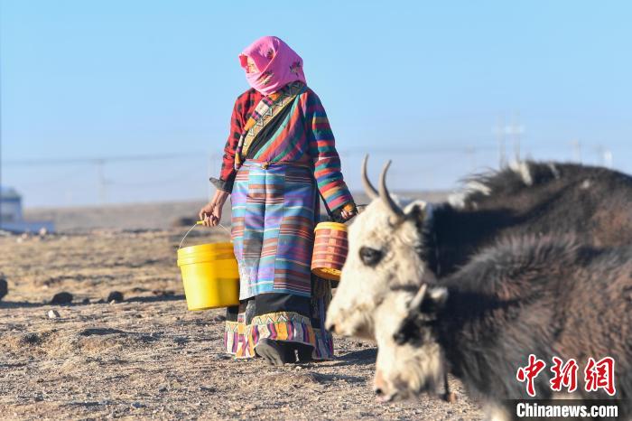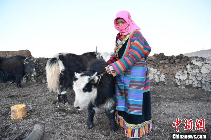 12月12日,西藏自治區(qū)那曲市安多縣帕那鎮(zhèn)牧民土巴卓瑪準備去擠牦牛奶。中新社記者 貢嘎來松 攝