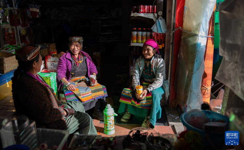 12月13日,三名陳塘鎮(zhèn)夏爾巴婦女在商店里喝奶茶聊天。