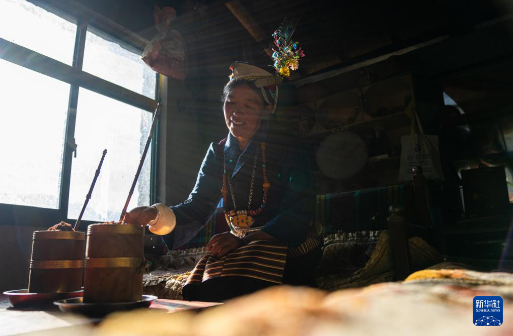 12月13日,陳塘鎮(zhèn)夏爾巴婦女仁增為客人準(zhǔn)備飲當(dāng)?shù)靥禺a(chǎn)雞爪谷酒。