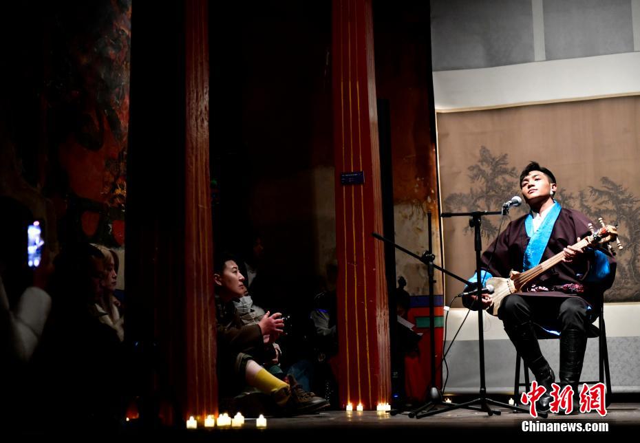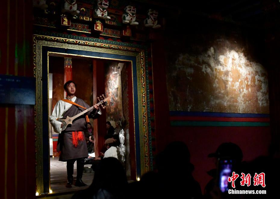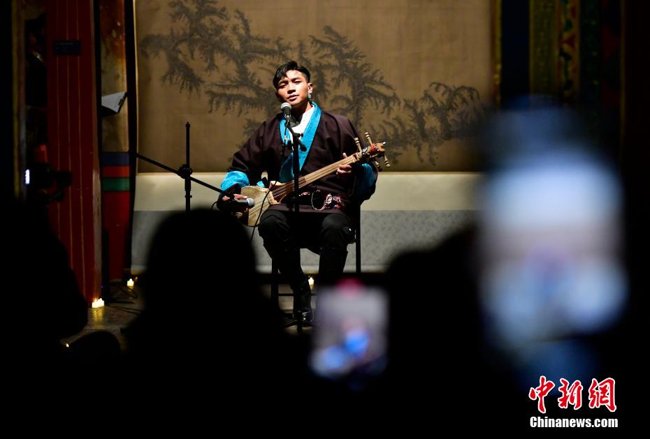 12月23日晚,西藏拉薩吉本崗藝術(shù)中心舉行吉光之夜活動。朗瑪堆諧、扎木念彈唱、熱巴舞等非遺展演,吸引眾多民眾共同領(lǐng)略西藏非物質(zhì)文化遺產(chǎn)的無窮魅力。圖為扎木念彈唱《甲林賽》。中新社記者 李林 攝