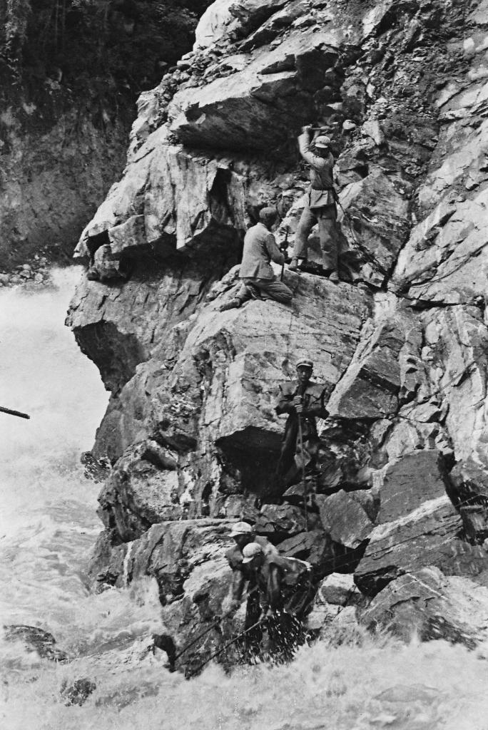 1953年,修筑川藏公路的解放軍戰(zhàn)士在懸崖上勞動。