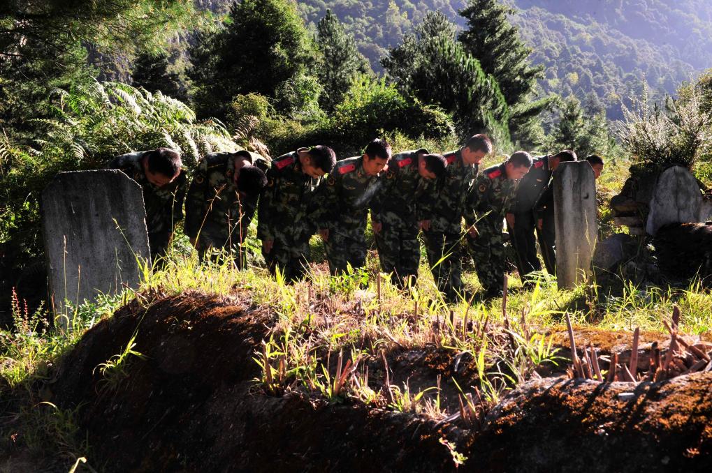 2014年9月18日,武警交通二支隊的官兵在波密縣烈士陵園祭奠烈士。在川藏公路沿線的許多地方,都有為當(dāng)年筑路部隊和當(dāng)代護路部隊因公犧牲的烈士所建的陵園。