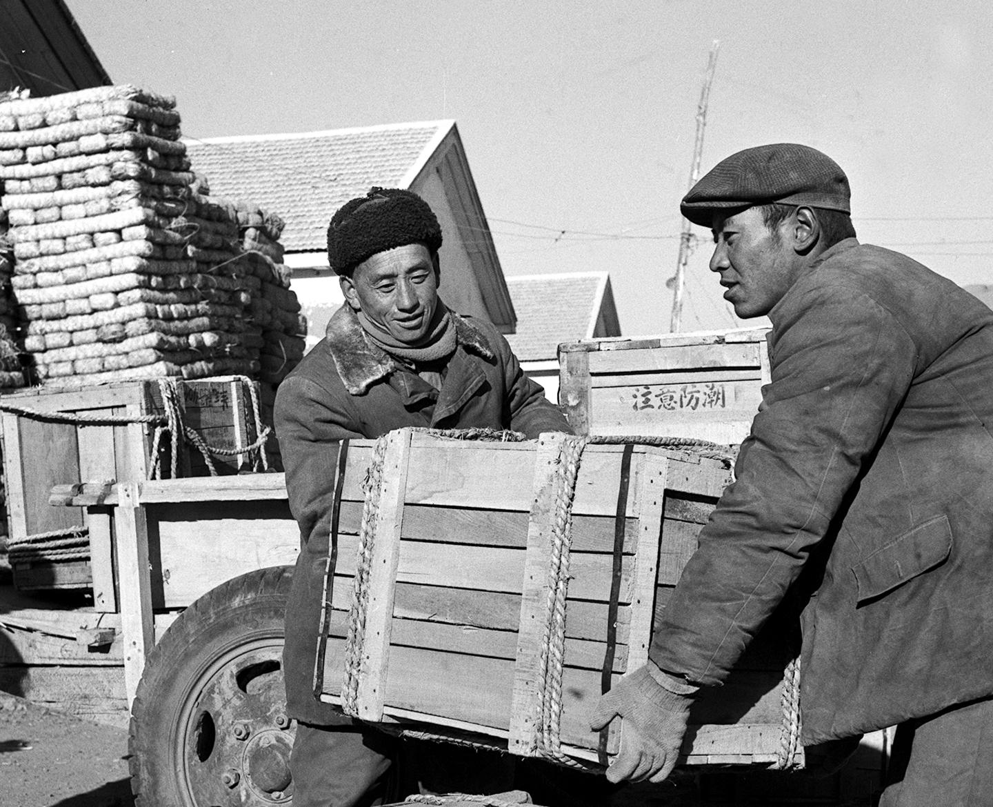 1964年,西藏山南貿(mào)易部門的工作人員在卸貨。不少生活用品沿著青藏公路和川藏公路源源運進西藏。