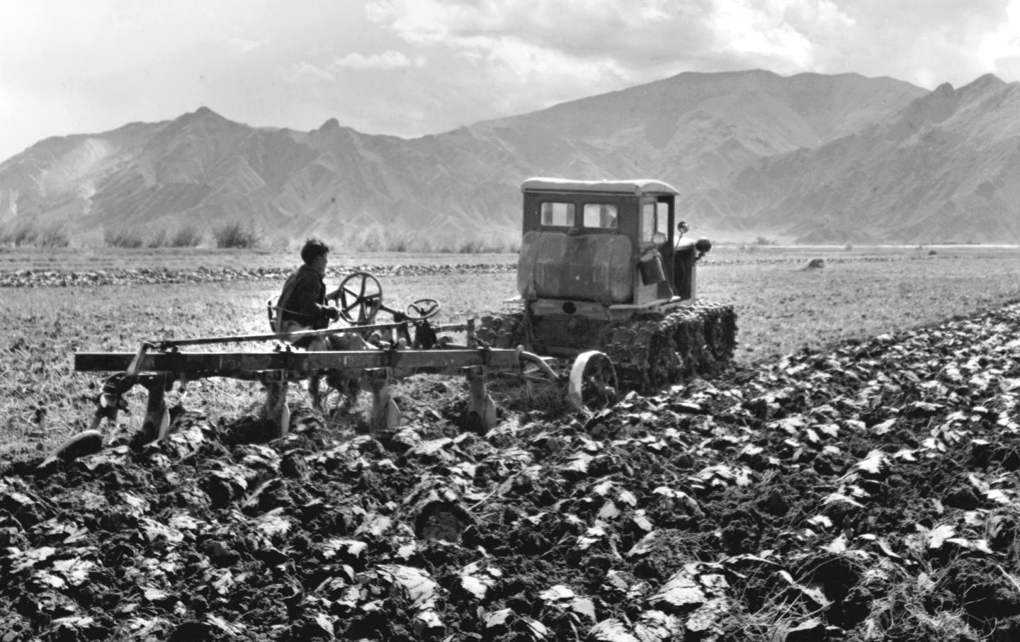 1964年,農(nóng)民使用拖拉機在拉薩郊外進行秋耕。青藏公路和川藏公路通車后,許多新式農(nóng)具通過公路運到了西藏。