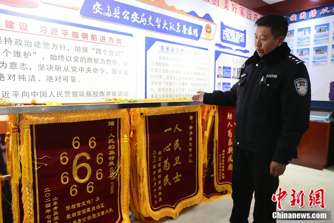 圖為安多縣交警向記者展示多年來獲贈的部分錦旗。中新社記者 薛蒂 攝