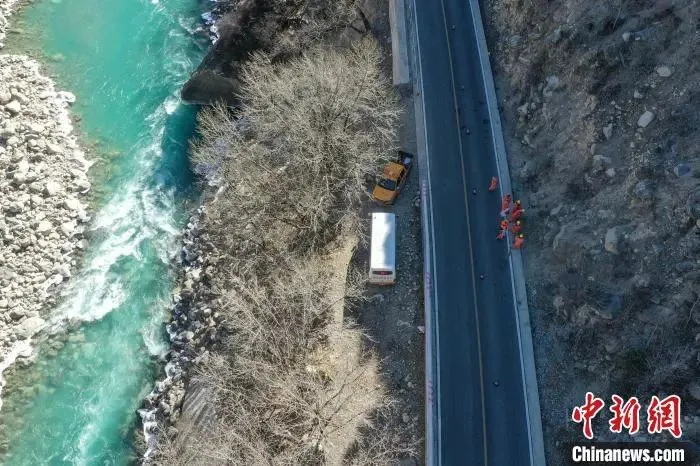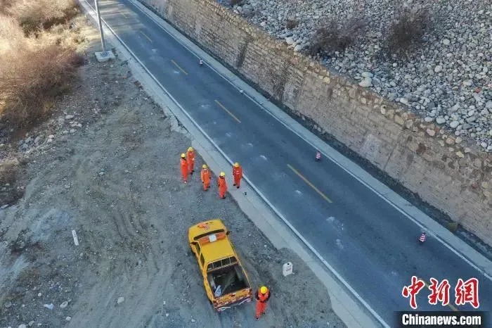 圖為道班工人在公路上巡護(hù)。(無人機照片)中新社記者 貢嘎來松 攝