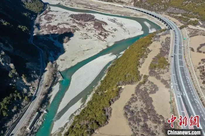 圖為部分養(yǎng)護(hù)路段(右)。(無人機照片)中新社記者 貢嘎來松 攝