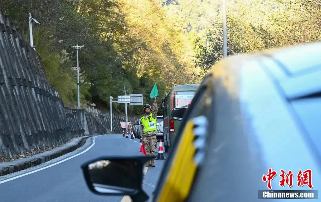 圖為管護(hù)完畢后,武警官兵放行等待車輛。中新社記者 趙朗 攝