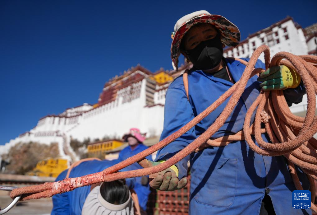 布達(dá)拉宮管理處維修科工作人員在整理安全繩,準(zhǔn)備粉刷墻體(12月4日攝)。新華社記者 晉美多吉 攝