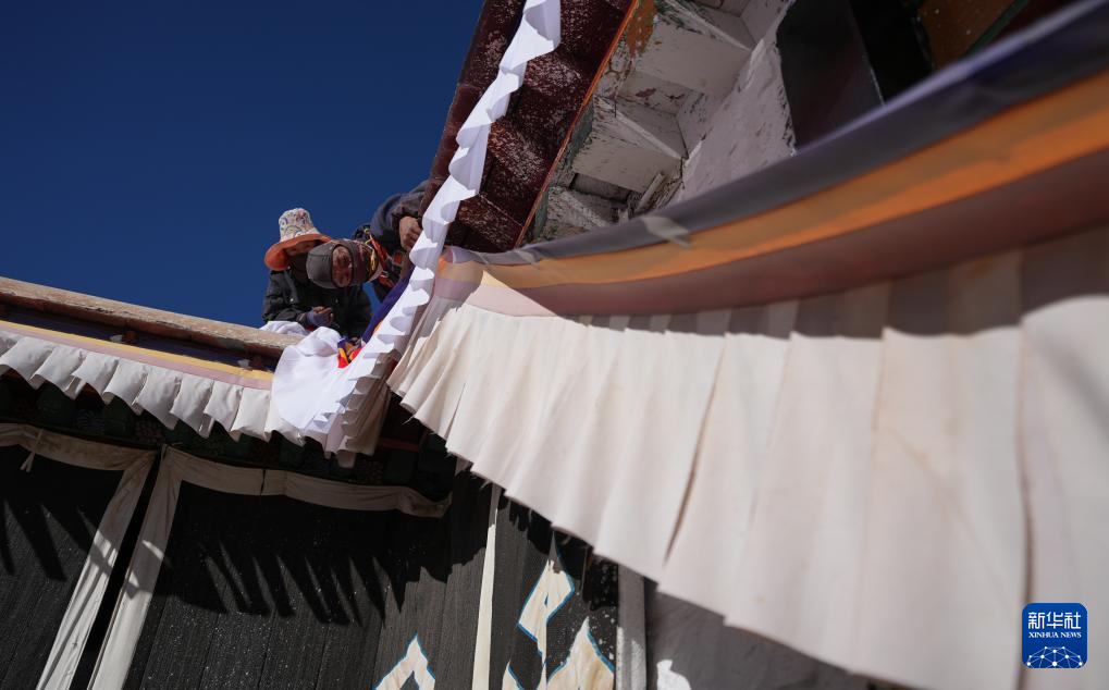 布達(dá)拉宮管理處維修科工作人員格桑央金(左)和朗杰在更換香布(12月4日攝)。新華社記者 晉美多吉 攝