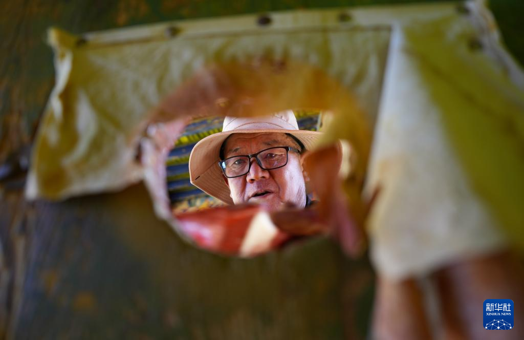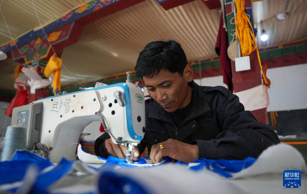 布達(dá)拉宮管理處維修科工作人員仁青在縫制門簾(12月4日攝)。新華社記者 晉美多吉 攝