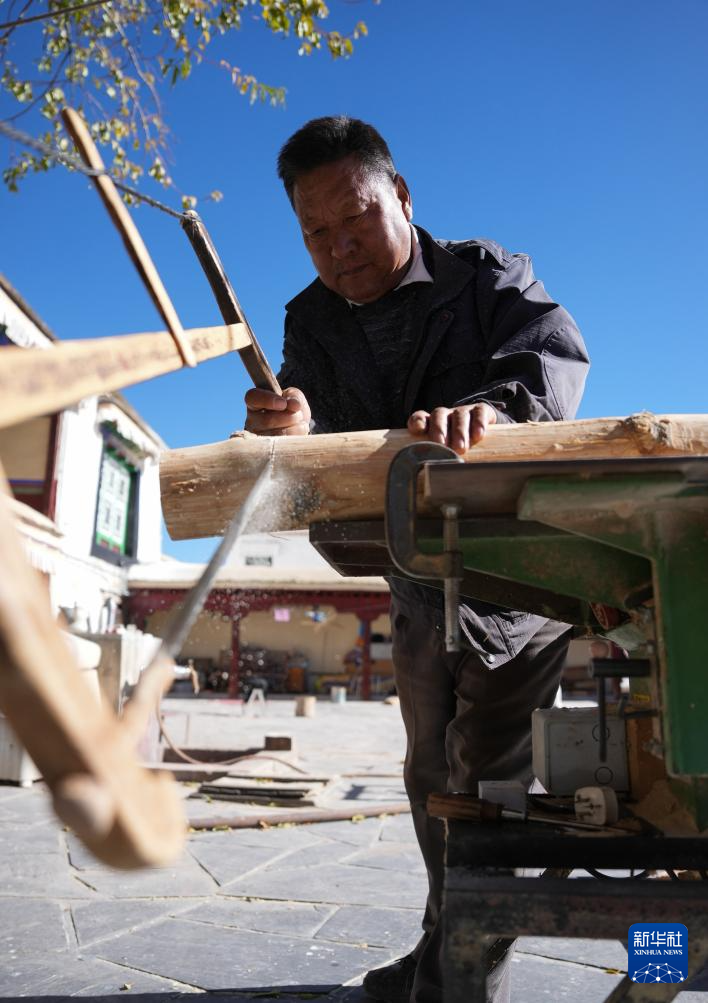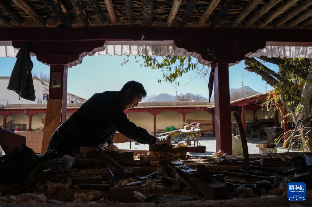 布達(dá)拉宮管理處維修科工作人員普瓊在制作修繕?biāo)璧哪緲?gòu)件(12月4日攝)。新華社記者 晉美多吉 攝