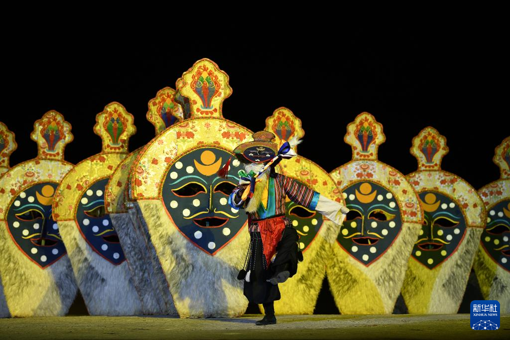 2021年4月10日,演員在大型實景劇《文成公主》中表演藏戲片段。拉薩布制面具制作技藝西藏自治區(qū)級非遺傳承人西洛創(chuàng)辦的拉薩市達(dá)孜區(qū)雪鄉(xiāng)扎西崗傳統(tǒng)手工藝合作社多次為該劇提供道具支持。新華社記者 孫瑞博 攝