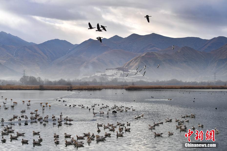 12月29日,冬日早晨,拉薩美如畫。拉薩河被晨光染成金色,河水靜靜流淌。西藏自治區(qū)拉薩市的拉魯濕地國家級自然保護區(qū)內(nèi),候鳥歡快,忙著覓食、嬉戲。遠處,布達拉宮與拉魯濕地相互映襯,構成了一幅絕美畫卷。圖為12月29日,在拉魯濕地越冬的候鳥成群結隊。貢確 攝