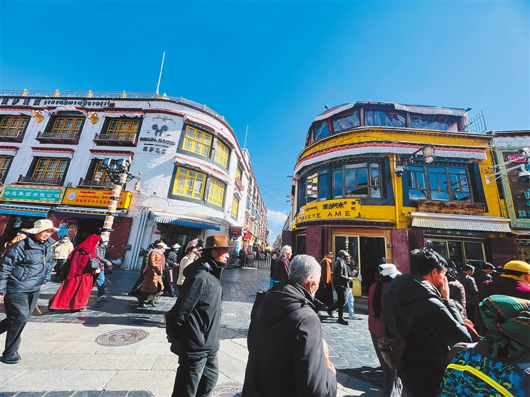 無論春夏秋冬,八廓街始終熱鬧非凡。每年春、夏、秋三季,國內(nèi)外游客紛至沓來;冬季,許多來自邊遠農(nóng)牧區(qū)的群眾會前來游玩、購買年貨。尤其是2024年“冬游西藏”活動的開啟,更是讓八廓街的人氣爆棚。走進八廓街,周邊的藏式特色建筑、琳瑯滿目的民俗風(fēng)情商品、絡(luò)繹不絕的游客,共同構(gòu)成了一幅獨特而又和諧的畫面。這里商業(yè)與人文并存、傳統(tǒng)與現(xiàn)代交織,游客們既能感受到文化底蘊,又能享受到現(xiàn)代商業(yè)的便利和多元。