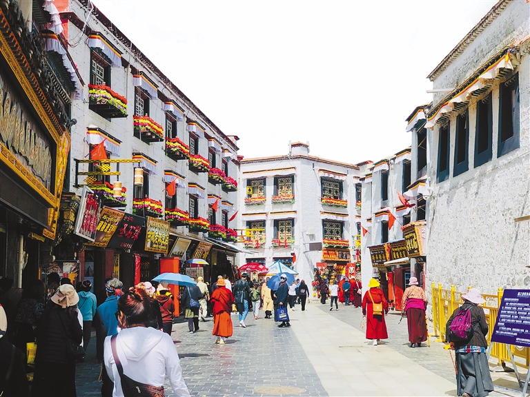 如今的八廓街,已成為獨具民族特色和魅力的傳統(tǒng)文化街區(qū),吸引著來自各地的游客。正如來自武漢的游客李玥所說:“西藏是一生必來之地,我們在老家舉辦完婚禮后,將蜜月旅行地選在了日光之城拉薩。走進八廓街,仿佛穿越了時空的隧道,色彩斑斕的建筑,每一座建筑都在訴說著古老的故事。八廓街,有著不同的顏色、不同的人文、不同的語言、不同的建筑、不同的穿著,一切都是那么的不同?!?/p>