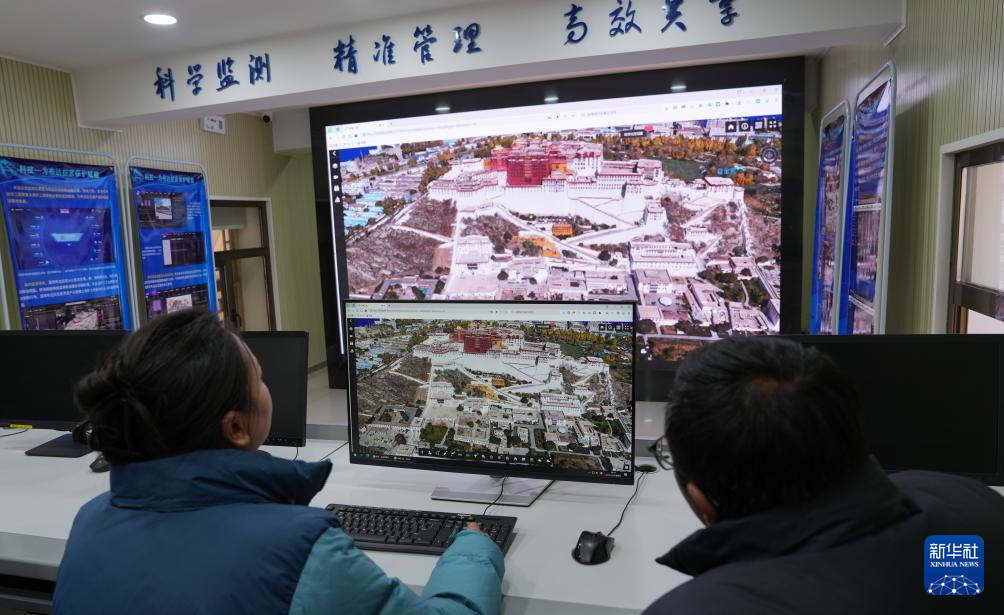 12月4日,布達拉宮監(jiān)測中心的工作人員在查看無人機拍攝的圖像。新華社記者 晉美多吉 攝