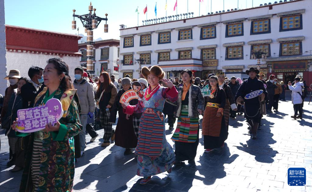 1月3日,模特在拉薩八廓街巡游。新華社記者 晉美多吉 攝