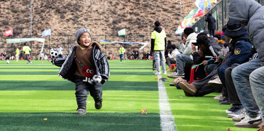 在馬利鎮(zhèn)“云中球場(chǎng)”,小球迷們?cè)诩佑椭?月2日攝)。新華社記者 丁增尼達(dá) 攝