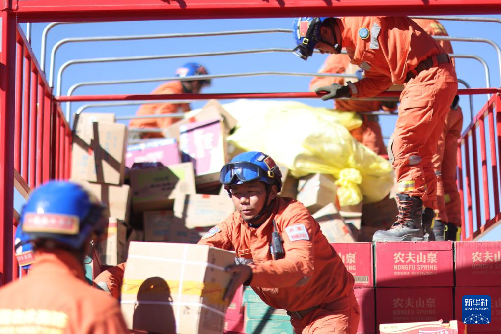 1月9日,救援人員在措布村卸載救災物資。新華社記者 姜帆 攝