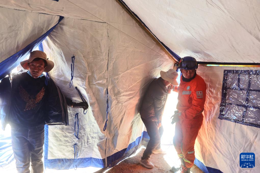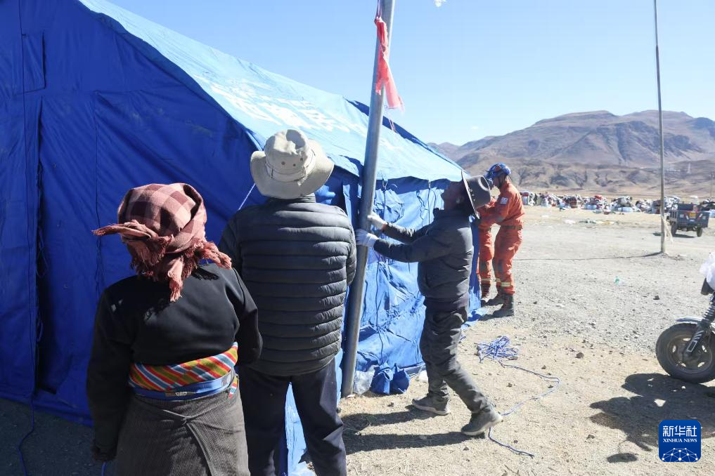 1月9日,救援人員在措布村幫助受災群眾搭建帳篷。新華社記者 姜帆 攝