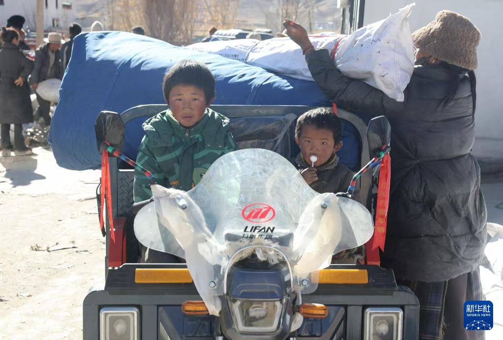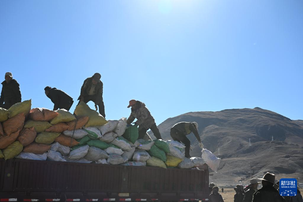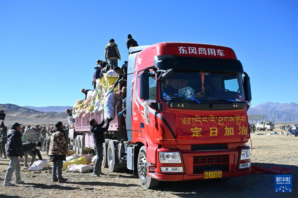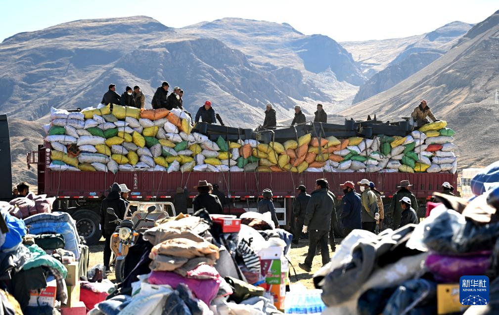 1月9日,受災群眾在措布村卸載救災物資。新華社記者 李響 攝