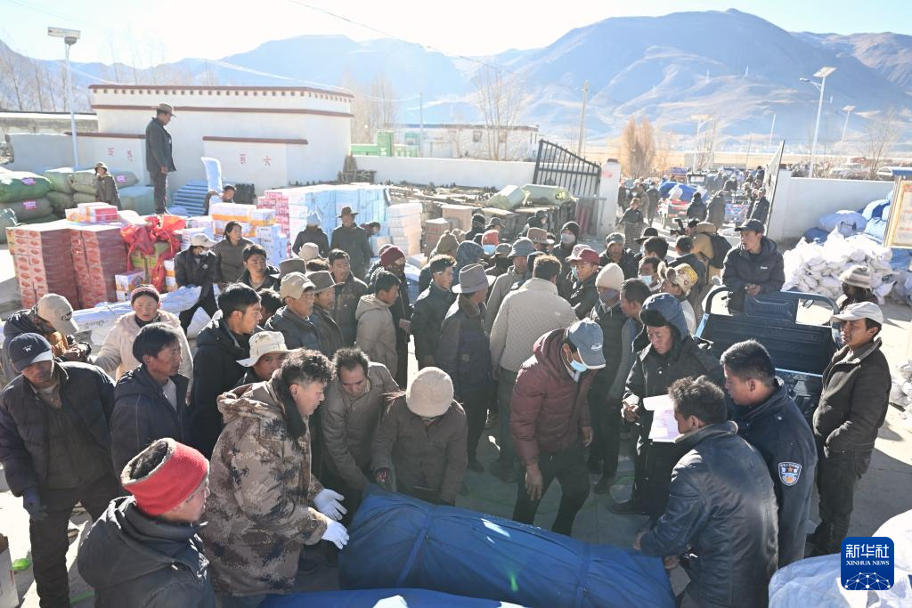 1月9日,受災群眾在措布村村委會領(lǐng)取救災物資。新華社記者 李響 攝