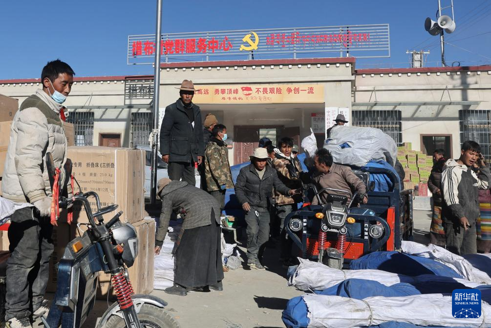 1月9日,受災群眾在措布村村委會領(lǐng)取救災物資。新華社記者 姜帆 攝