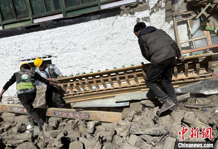 圖為退役軍人志愿者幫助災民清理倒塌的雜物。云丹平措 供圖