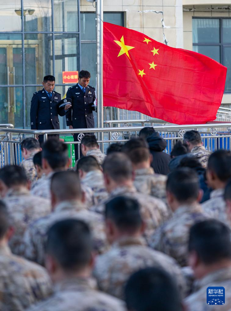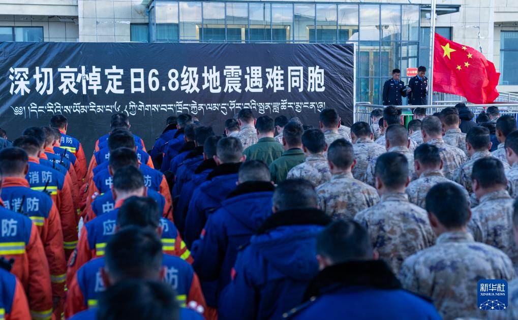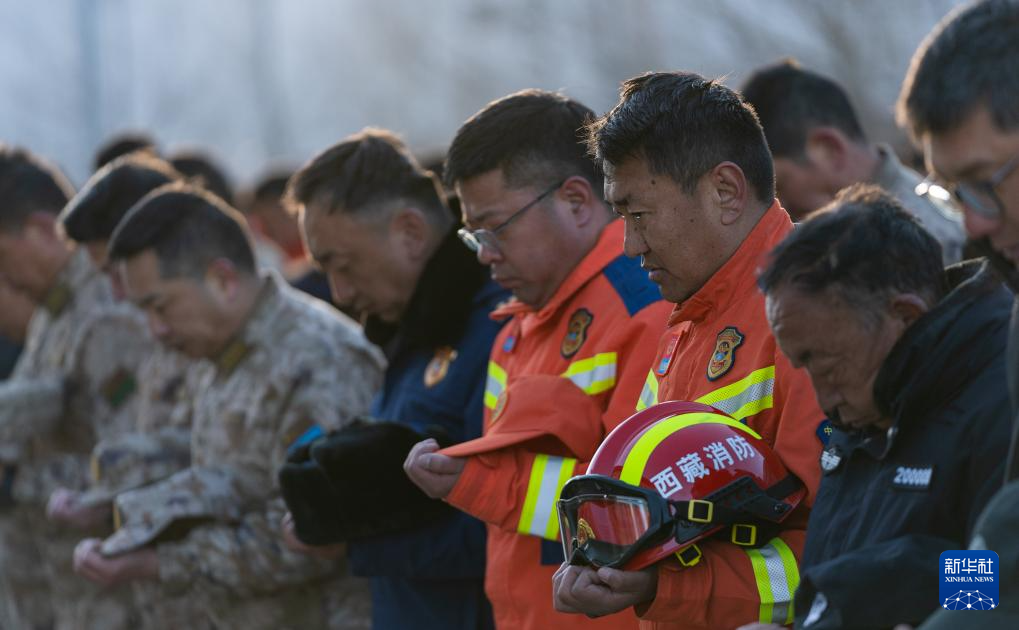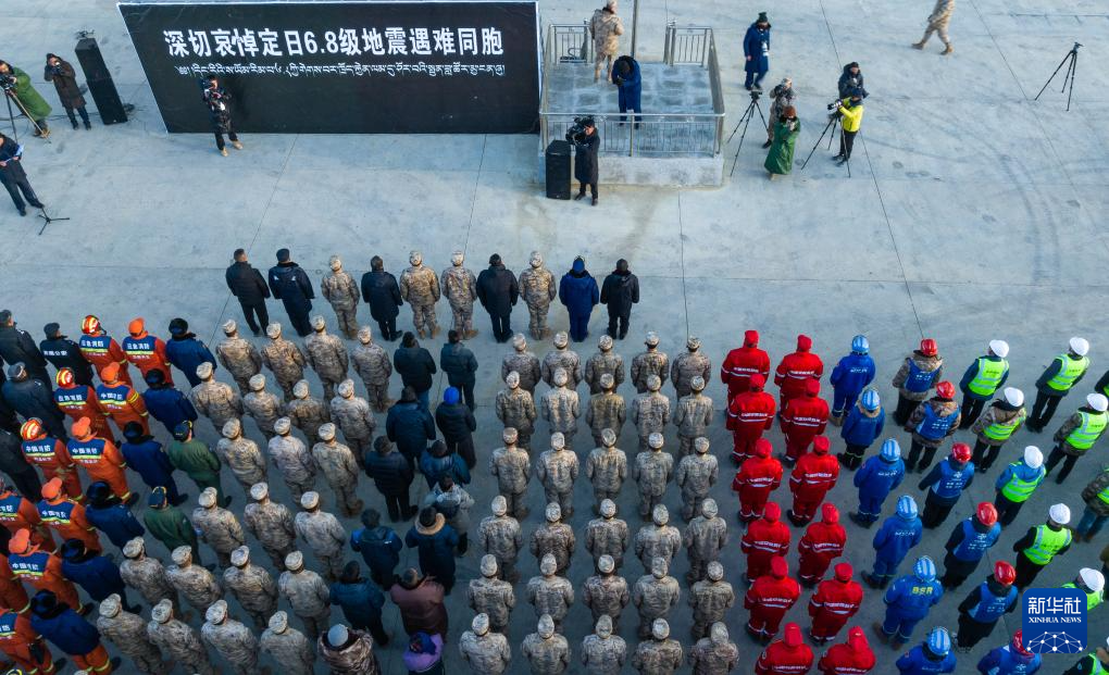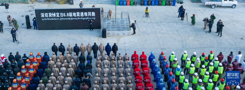 1月13日上午9時(shí)30分,西藏定日6.8級(jí)地震遇難同胞悼念儀式在受災(zāi)最嚴(yán)重的長(zhǎng)所鄉(xiāng)舉行。參與救援的解放軍和武警官兵、消防救援人員、公安民警、醫(yī)護(hù)人員、青年志愿者及有關(guān)企業(yè)員工、干部職工、震區(qū)群眾代表數(shù)百人,脫帽肅立,向遇難同胞默哀3分鐘。新華社記者 丁增尼達(dá) 攝