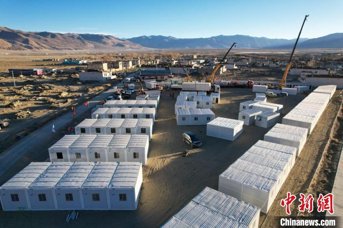 圖為1月10日,西藏定日縣長(zhǎng)所鄉(xiāng)森嘎村正搭建移動(dòng)板房。(無(wú)人機(jī)畫面)江飛波 攝