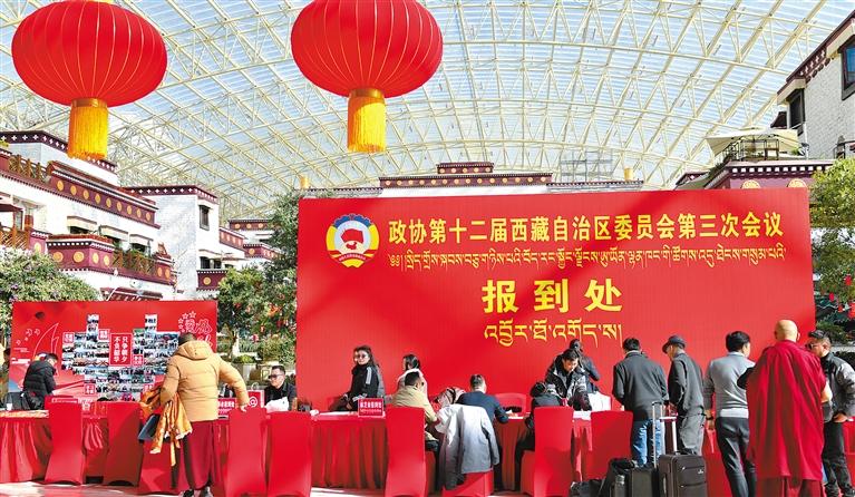 在拉薩圣地天堂洲際大飯店,自治區(qū)政協(xié)委員報到工作有條不紊進(jìn)行。政協(xié)委員們精神飽滿、激情滿懷地討論各自帶來的提案。