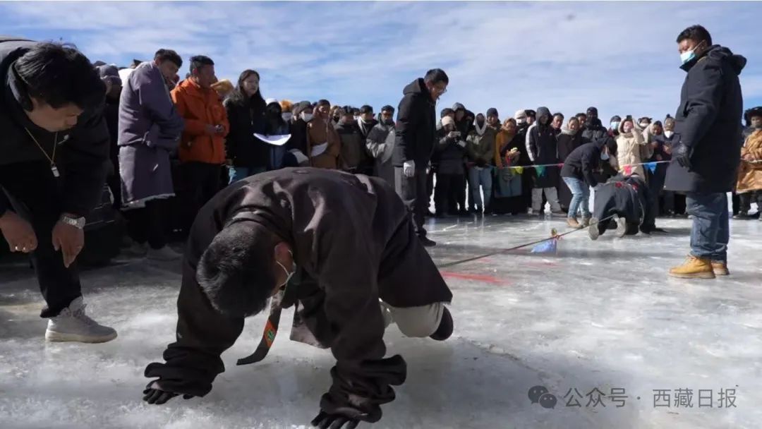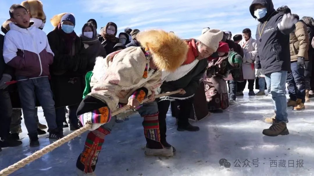 賽場上,傳統(tǒng)冰上項(xiàng)目亮點(diǎn)紛呈。牛嘎滑冰車(個(gè)人)賽中,選手身輕如燕,技巧嫻熟,在冰面上風(fēng)馳電掣;木制滑冰車(個(gè)人)和親子賽同樣扣人心弦,無論是個(gè)人賽的奮勇爭先,還是親子賽的默契配合,都讓觀眾們目不暇接。自由滑冰賽里,大家展現(xiàn)著冰雪運(yùn)動(dòng)的自由與奔放。團(tuán)隊(duì)項(xiàng)目更是將氣氛推向頂點(diǎn)。冰上拔河,大家腳蹬冰面、咬緊牙關(guān)、全力拉扯,每一寸繩子的移動(dòng)都牽動(dòng)著眾人的心。冰上接力賽中,選手交接棒時(shí)的默契配合、全力沖刺,傳遞著團(tuán)結(jié)與拼搏的力量。吶喊聲、歡呼聲交織在一起,在夯錯(cuò)湖畔久久回蕩。