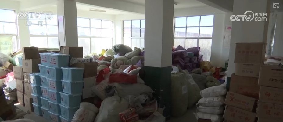 村民們居住的板房面積有限,也不能存放太多的物資,所有的物資都集中在村里的一個(gè)小學(xué)里,非常充足。